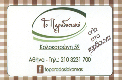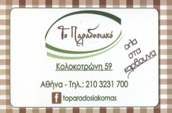customer tabsΕπικοινωνίαΨητοπωλεία - ΟβελιστήριαΔιασκέδαση - ΕστίασηΚολοκοτρώνη 59, ΑθήναΑΘΗΝΑ ΑΤΤΙΚΗΣΑΤΤΙΚΗ 2103231700toparadosiakomas@gmail.comΤο Παραδοσιακο Το προτείνω (έχει προταθεί 0 φορές) ΦωτογραφίεςFacebook LikeShare on FacebookTweet Widget