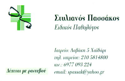 customer tabsΕπικοινωνίαΔέχεται καθημερινά 17:00-21:00 κατόπιν ραντεβού.ΠαθολόγοιΥγείαΔαβάκη 5, ΧαϊδάριΧΑΪΔΑΡΙ ΑΤΤΙΚΗΣΑΤΤΙΚΗ 2105814800 69770932242105814800spassak@yahoo.gr Το προτείνω (έχει προταθεί 0 φορές) ΦωτογραφίεςFacebook LikeShare on FacebookTweet Widget