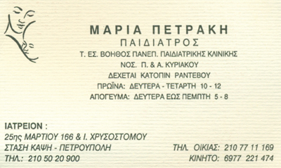 customer tabsΕπικοινωνίαΔέχεται με ραντεβού:Δευτέρα - Τετάρτη 10:00-12:00 Απογεύματα 17:00-20:00 εκτός Παρασκευής ΠαιδίατροιΥγεία25ης Μαρτίου 166, ΠετρούποληΠΕΤΡΟΥΠΟΛΗ ΑΤΤΙΚΗΣΑΤΤΙΚΗ 2105020900 6977221474 Το προτείνω (έχει προταθεί 0 φορές) ΦωτογραφίεςFacebook LikeShare on FacebookTweet Widget