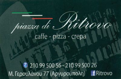customer tabsΕπικοινωνίαΠιτσαρίεςΚαφέδεςΣνακΚρεπερίΔιασκέδαση - ΕστίασηΛοιπάΤουρισμόςΜαρίνου Γερουλάνου 77, ΑργυρούποληΑΡΓΥΡΟΥΠΟΛΗ ΑΤΤΙΚΗΣΑΤΤΙΚΗ 2109950056ritrovo_p@gmail.comRitrovo Το προτείνω (έχει προταθεί 1 φορές) ΦωτογραφίεςFacebook LikeShare on FacebookTweet Widget