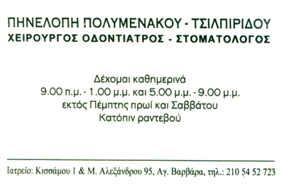 customer tabsΕπικοινωνίαΔέχεται καθημερινά 09:00 -13:00 & 17:00-21:00 εκτός ΠέμπτηςΧειρουργοί ΟδοντίατροιΥγείαΚισσάμου 1 και Μεγ. Αλεξάνδρου 95ΑΓΙΑ ΒΑΡBΑΡΑ ΑΤΤΙΚΗΣΑΤΤΙΚΗ 2105452723 6974175165 Το προτείνω (έχει προταθεί 1 φορές) ΦωτογραφίεςFacebook LikeShare on FacebookTweet Widget