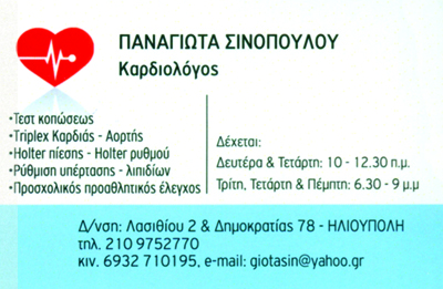 customer tabsΕπικοινωνίαΕιδικός ΚαρδιολόγοςΩράριο: Δευτέρα & Τετάρτη 10:00 -13:00Τρίτη - Τετάρτη - Πέμπτη 18:30 -21:00ΚαρδιολόγοιΥγείαΛασιθίου 2 & Δημοκρατίας 78, Ηλιούπολη, ΑττικήΑΘΗΝΑ ΑΤΤΙΚΗΣΑΤΤΙΚΗ 2109752770 6932710195giotasin@yahoo.gr Το προτείνω (έχει προταθεί 0 φορές) ΦωτογραφίεςFacebook LikeShare on FacebookTweet Widget