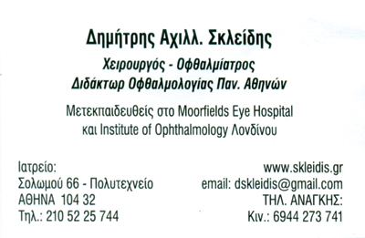 customer tabsΕπικοινωνίαΧειρουργός Οφθαλμίατρος, Διδάκτωρ Πανεπιστημίου Αθηνών,Δέχεται καθ/να Δευτέρα & Τρίτη 14:00-19:00 και Τετάρτη & Παρασκευή 08:30-14:00 με ραντεβού.ΟφθαλμίατροιΥγείαΣολωμού 66, Πολυτεχνείο, ΑθήναΑΘΗΝΑ ΑΤΤΙΚΗΣΑΤΤΙΚΗ 2105225744 6944273741dskleidis@gmail.comdskleidis@yahoo.comwww.skleidis.gr Το προτείνω (έχει προταθεί 0 φορές) ΦωτογραφίεςFacebook LikeShare on FacebookTweet Widget