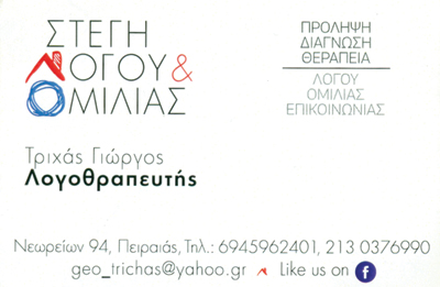 customer tabsΕπικοινωνίαΜαθησιακές δυσκολίεςΔυσλεξίαΑυτισμόςΚινητικές διαταραχέςΕργοθεραπείαΝοητική στέρησηΔιαταραχές λόγου - ομιλίαςψυχολογική υποστήριξηΕιδικές αγωγέςΛογοπεδικοί - ΛογοθεραπευτέςΥγείαΝεωρείων 94, ΠειραιάςΠΕΙΡΑΙΑΣ ΑΤΤΙΚΗΣΑΤΤΙΚΗ 2130376990 6945962401Στέγη Λόγου & Ομιλίας Το προτείνω (έχει προταθεί 0 φορές) ΦωτογραφίεςFacebook LikeShare on FacebookTweet Widget
