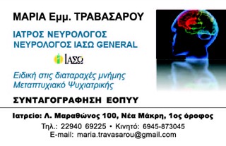 customer tabsΕπικοινωνίαΑπόφοιτος εθνικού Καποδιστριακού Πανεπιστημίου ΑθηνώνΕξειδίκευση στην άνοια (διαταραχή μνήμης)Μεταπτυχιακό στην ψυχιατρικήΕπιστημονικός συνεργάτης νοσοκομείου ΓεννηματάΣυνταγογράφηση ΕΟΠΥΥΝευρολόγοιΝευρολόγοι - ΨυχίατροιΥγείαΛεωφ. Μαραθώνος 100, Νέα ΜάκρηΝΕΑ ΜΑΚΡΗ ΑΤΤΙΚΗΣΑΤΤΙΚΗ 2294069225 6945873045maria.travasarou@gmail.com Το προτείνω (έχει προταθεί 0 φορές) ΦωτογραφίεςFacebook LikeShare on FacebookTweet Widget