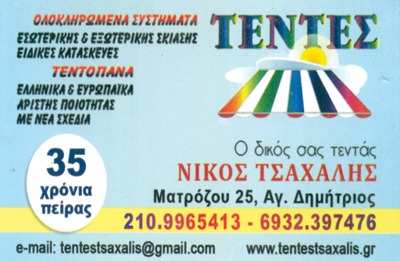 customer tabsΕπικοινωνίαΗ επιχείρηση μας “ΤΣΑΧΑΛΗΣ ΝΙΚΟΣ” η οποία εδρεύει στον Άγιο Δημήτριο Αττικής, δραστηριοποιείταιγια περισσότερα από 30 χρόνια στο χώρο των συστημάτων σκίασης, προσφέροντας ολοκληρωμένεςλύσεις σκίασης για κάθε χώρο, σε ανταγωνιστικές τιμές. Έχοντας ως σύμμαχο την εμπειρία 30 χρόνωνκαι την υπευθυνότητά μας, είμαστε δίπλα σας για να συζητήσουμε τις δικές σας ξεχωριστές ανάγκες,προσαρμοσμένες κατά τον καλύτερο δυνατό τρόπο στην οικία, το εξοχικό αλλά και τον επαγγελματικόσας χώρο.Τέντες και ΣκηνέςΣυστήματα ΣκίασηςΔόμηση - ΚατοικίαΜατρόζου 25, Αγ. Δημήτριος ΑττικήςΑΓΙΟΣ ΔΗΜΗΤΡΙΟΣ ΑΤΤΙΚΗΣΑΤΤΙΚΗ 2109965413 6932397476tentestsaxalis@gmail.comwww.tentestsaxalis.gr Το προτείνω (έχει προταθεί 0 φορές) ΦωτογραφίεςFacebook LikeShare on FacebookTweet Widget