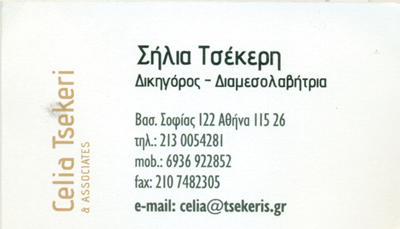 customer tabsΕπικοινωνίαΔικηγόροι και Δικηγορικά ΓραφείαΔιαπιστευμένος ΔιαμεσολαβητήςΥπηρεσίεςΛεωφ. Βασιλίσσης Σοφίας 122, 4ος όροφος, ΑθήναΑΘΗΝΑ ΑΤΤΙΚΗΣΑΤΤΙΚΗ 2130054281celia@tsekeris.gr Το προτείνω (έχει προταθεί 2 φορές) ΦωτογραφίεςFacebook LikeShare on FacebookTweet Widget