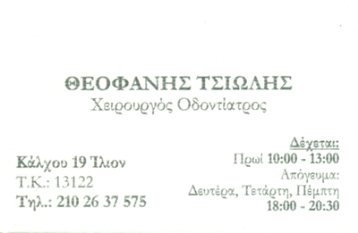 customer tabsΕπικοινωνίαΧειρουργοί ΟδοντίατροιΥγείαΚάλχου 19, ΊλιονΙΛΙΟΝ ΑΤΤΙΚΗΣΑΤΤΙΚΗ 2102637575tsio@yahoo.com Το προτείνω (έχει προταθεί 0 φορές) ΦωτογραφίεςFacebook LikeShare on FacebookTweet Widget