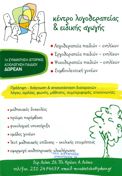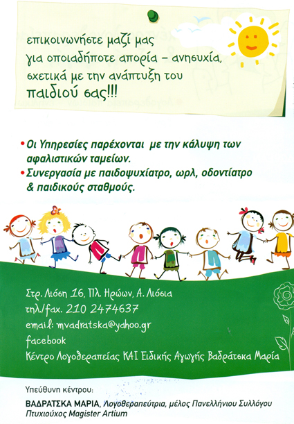 customer tabsΕπικοινωνίαΚέντρο Λογοθεραπείας και Ειδικής Αγωγής άνω ΛιοσίωνΛογοθεραπεία, Εργοθεραπεία, Ειδική ΔιαπαιδαγώγησηΜαθησιακές Δυσκολίες, Ψυχολογική ΥποστήριξηΛογοπεδικοί - ΛογοθεραπευτέςΥγείαΔημαρχείου 15, Άνω Λιόσια, ΑττικήΑΝΩ ΛΙΟΣΙΑ ΑΤΤΙΚΗΣΑΤΤΙΚΗ 2102474637mvadratska@yahoo.grhttps://www.facebook.com/mvadratska Το προτείνω (έχει προταθεί 0 φορές) ΦωτογραφίεςFacebook LikeShare on FacebookTweet Widget